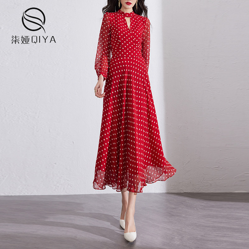 红色波点连衣裙女夏气质收腰气质长袖雪纺长裙长款沙滩裙海边度假
