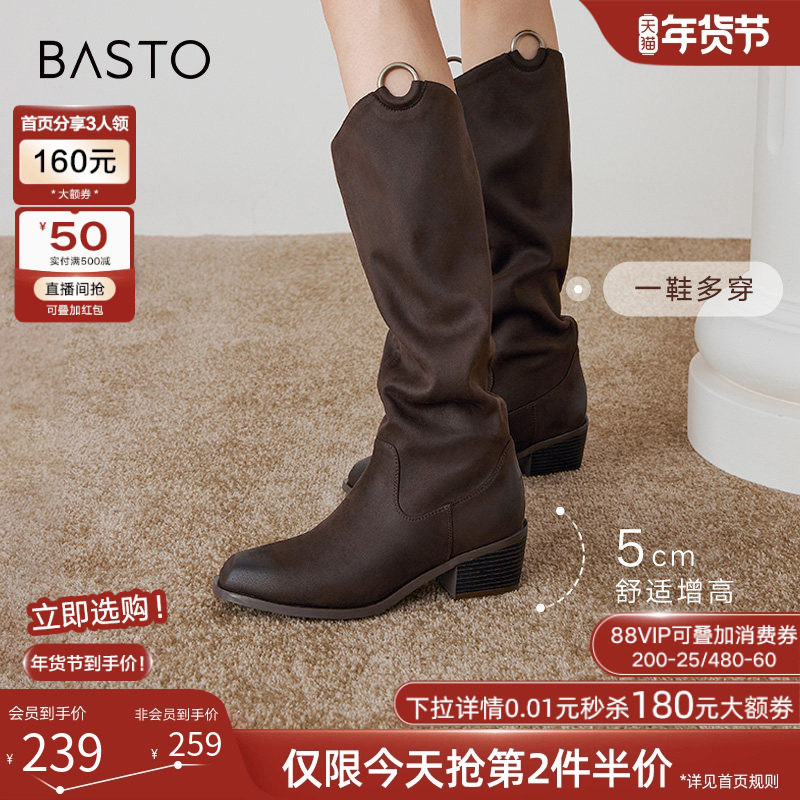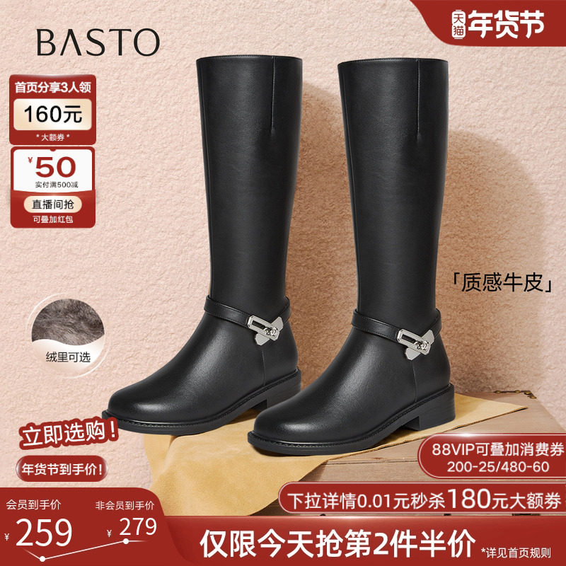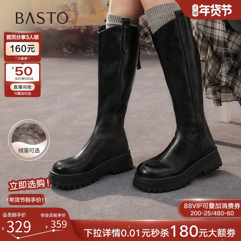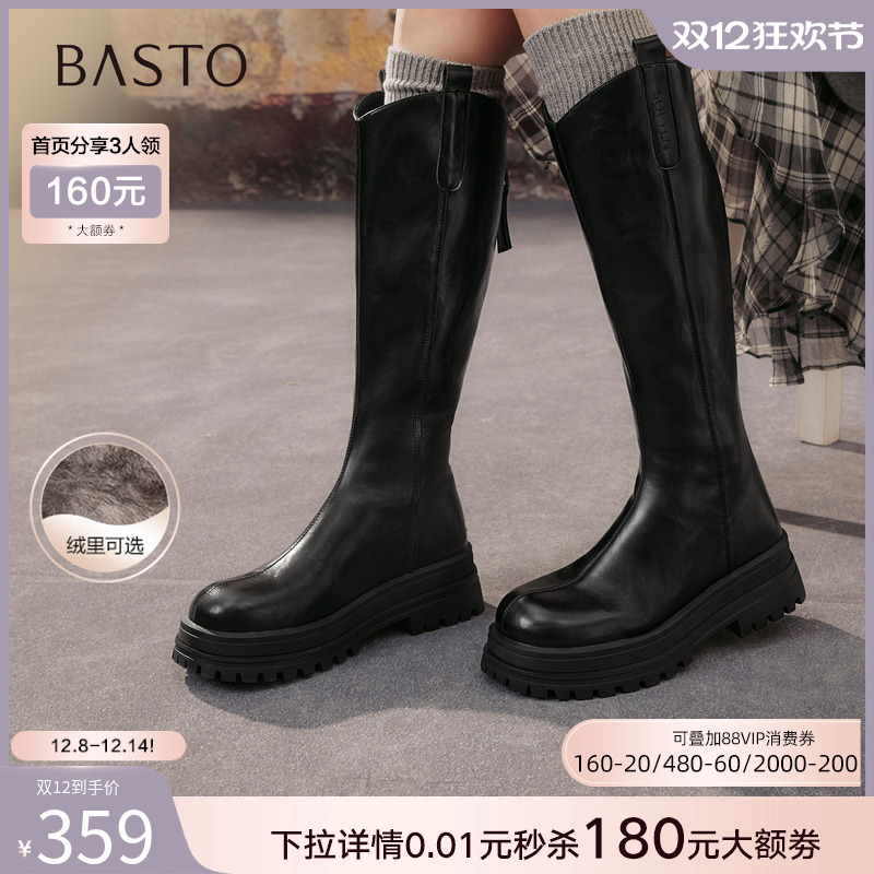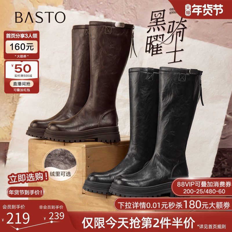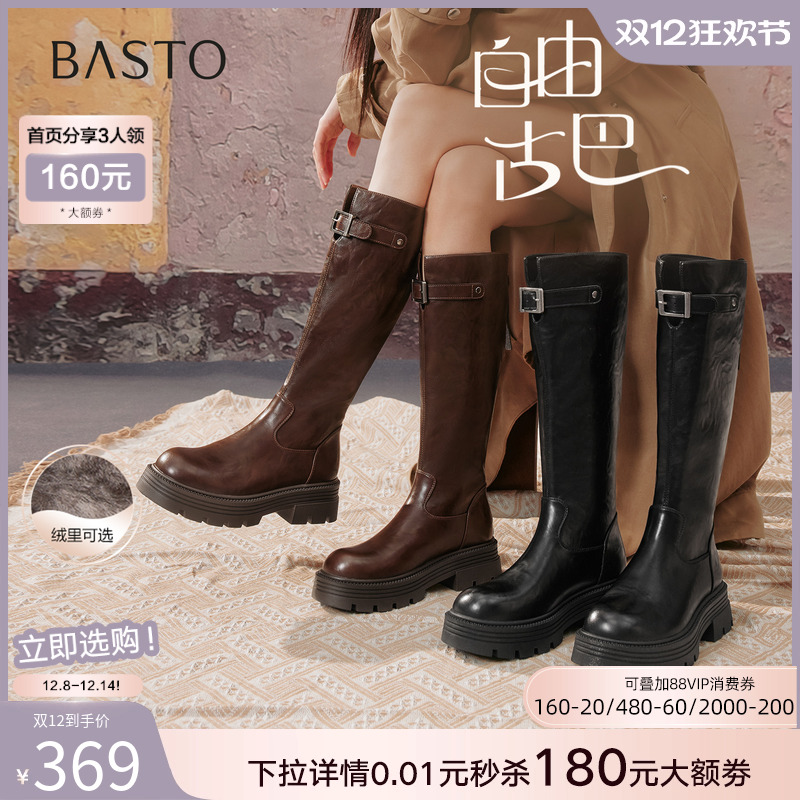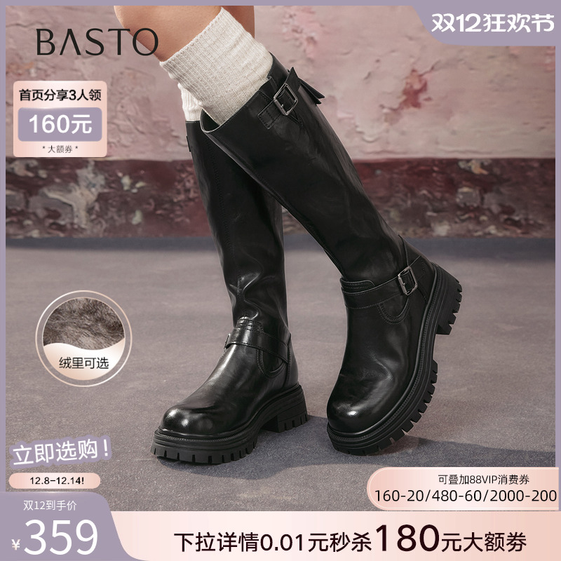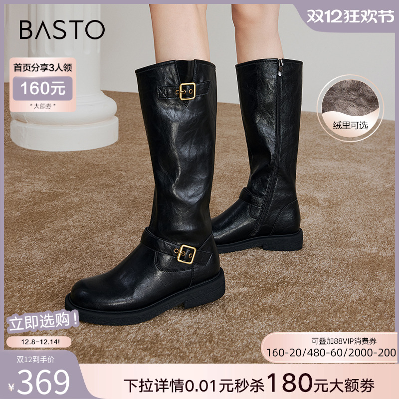 【自由古巴】百思图25冬商场新款加绒女高筒骑士靴粗腿显瘦长靴