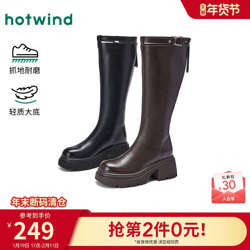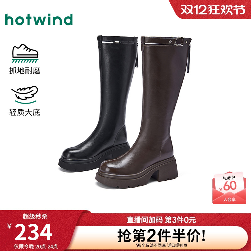 热风高筒骑士靴女2025年冬季新款粗跟黑色长筒靴百搭增高长靴子