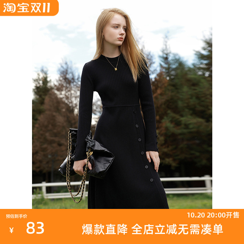 长袖连衣裙 秋冬新款显瘦针织裙中长款内搭打底毛衣裙女a字小黑裙