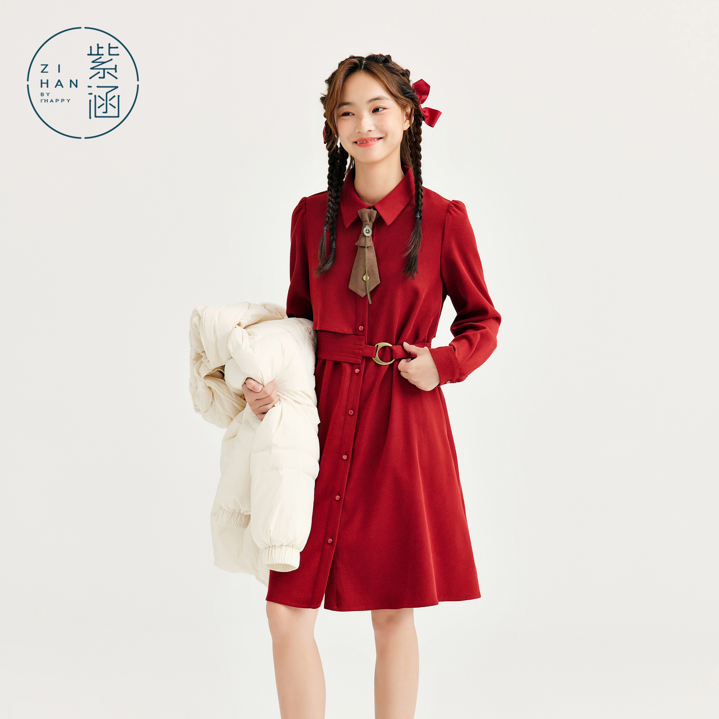 紫涵收腰风衣式连衣裙女冬季新款气质通勤风衬衫领长袖A字中长裙