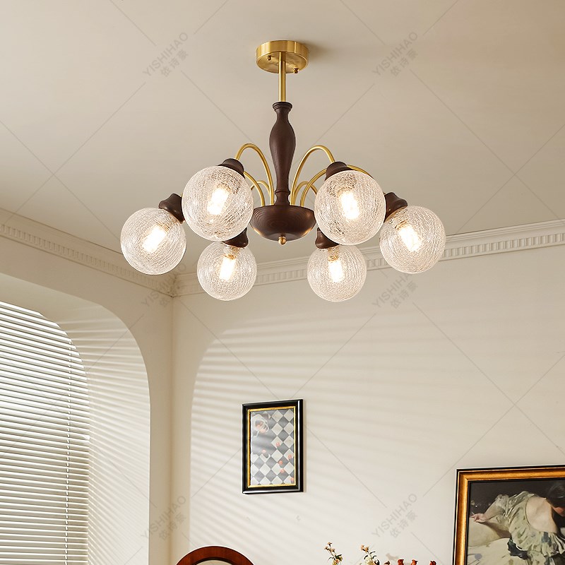 依诗豪 客厅灯 中古风吊灯客餐厅灯法式复古实木裂纹茶色玻璃灯具