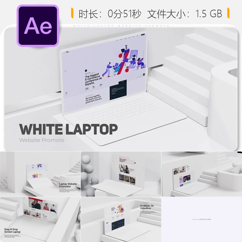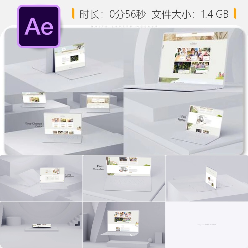 白色笔记本电脑网站推广AE模板商业广告3D渲染屏幕UI展示动画