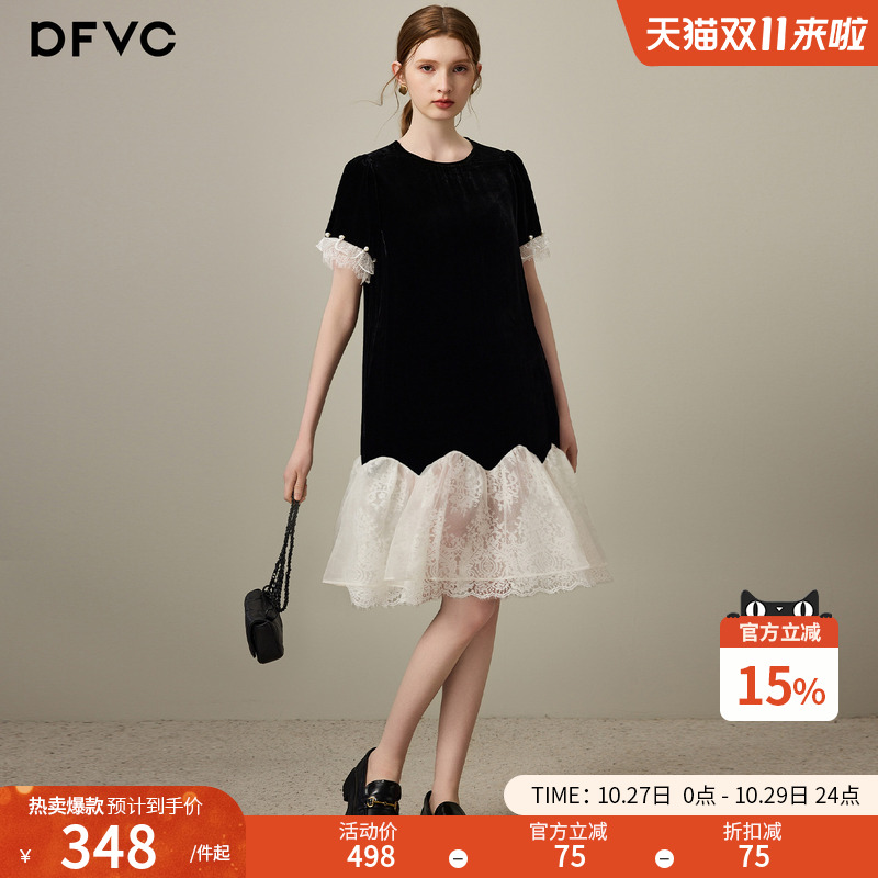 dfvc复古名媛人丝丝绒连衣裙女2025年秋季新款蕾丝拼接小个子裙子