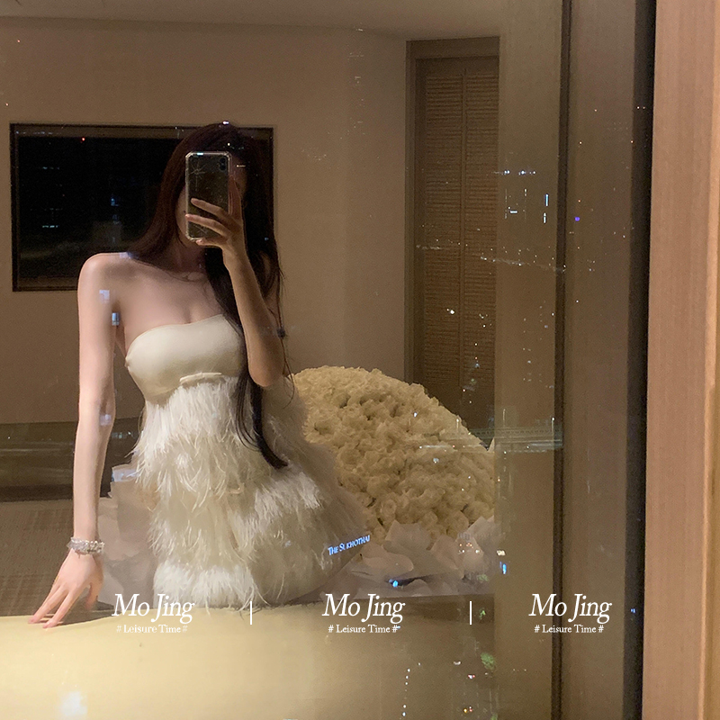 抹胸连衣裙女高级感名媛生日party小礼服羽毛拼接性感露背a字短裙