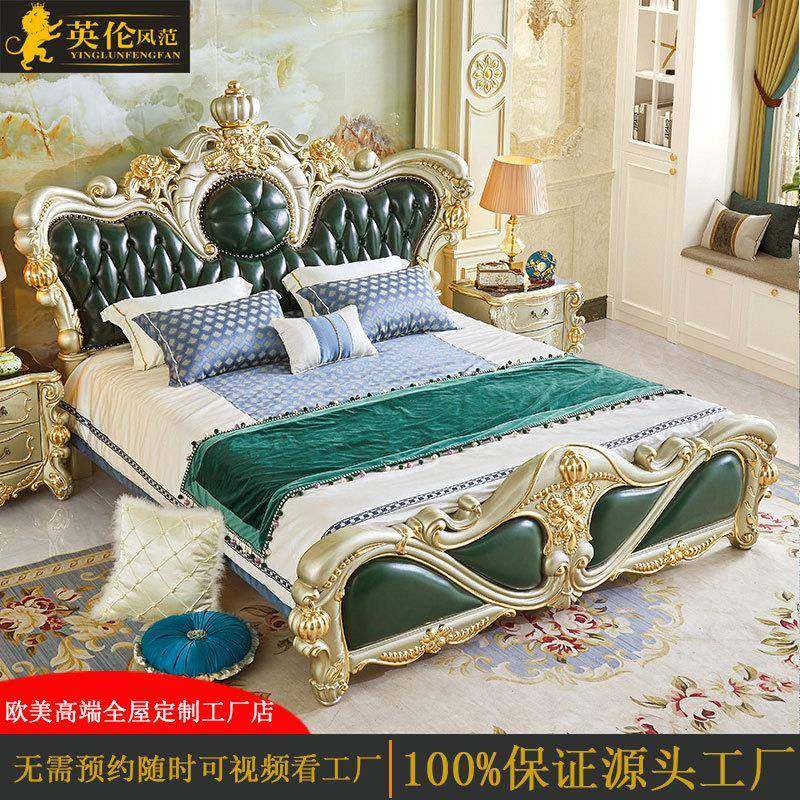 欧式全实木床 美式头层真皮婚床豪华雕花床 双人床实木雕花包邮新
