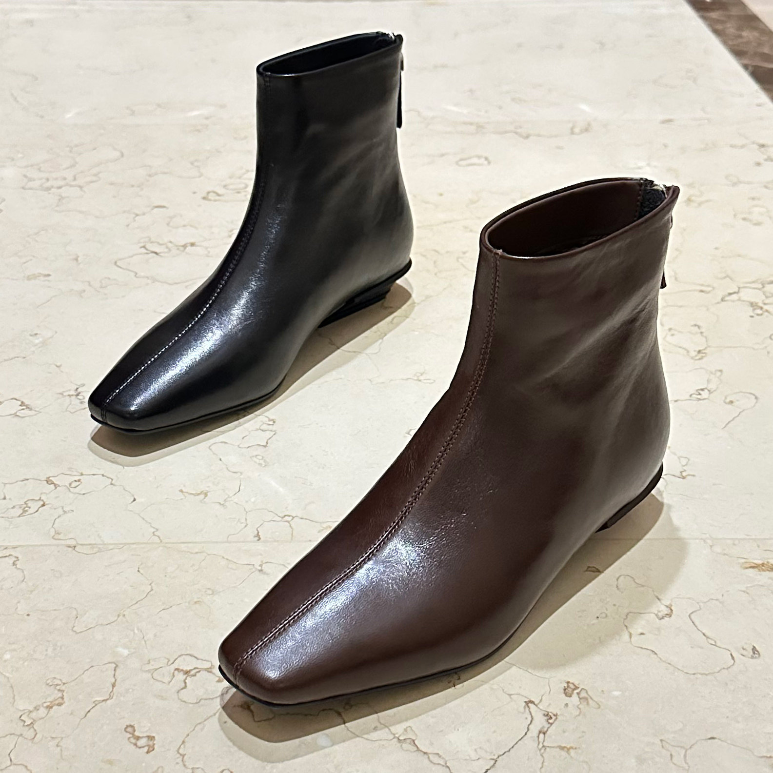 欧美2025新款女鞋方头平跟真皮裸靴百搭瘦瘦靴加绒简约老钱风短靴