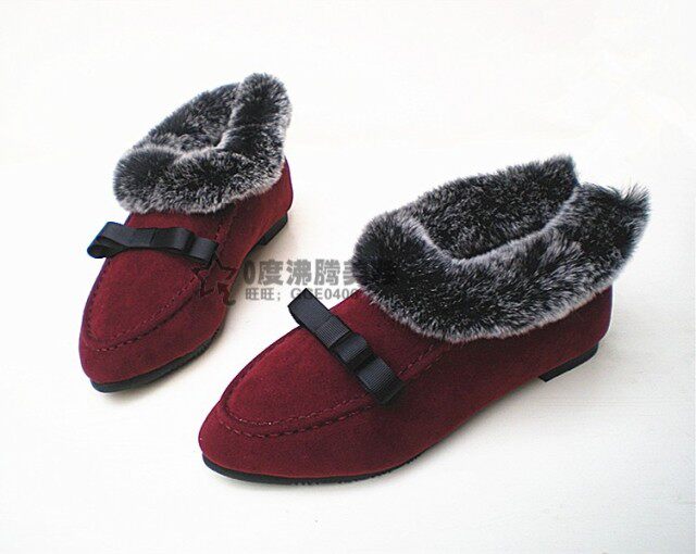 新款平跟底獭兔毛后拉链短靴保暖尖头裸靴内加绒蝴蝶结绒面女鞋子