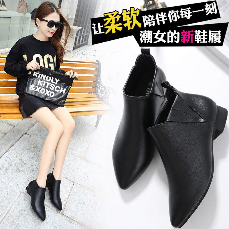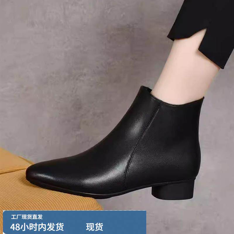 真皮尖头平跟短靴2025年秋冬新款粗跟软底百搭简约单靴小裸靴加绒