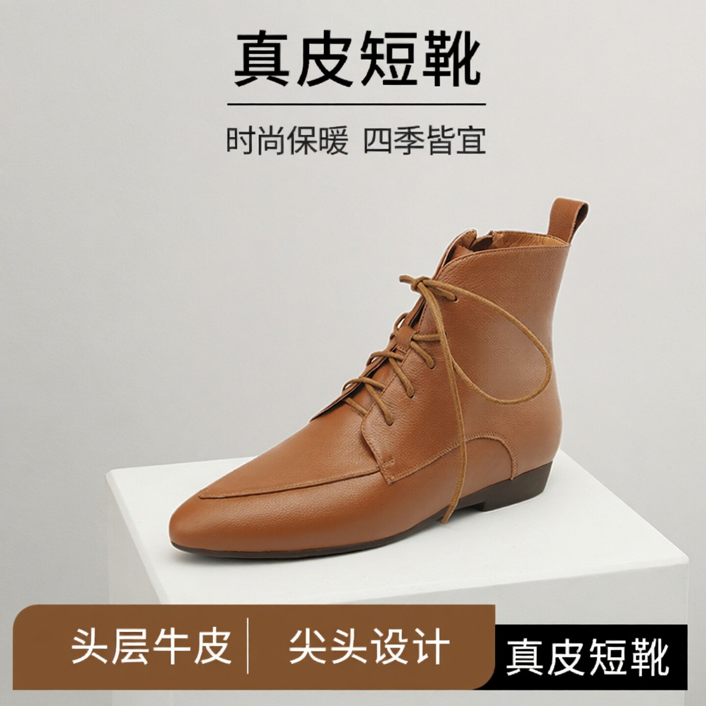 2025秋冬新款英伦风真皮圆头系带平跟短靴高帮鞋单靴裸靴休闲女鞋