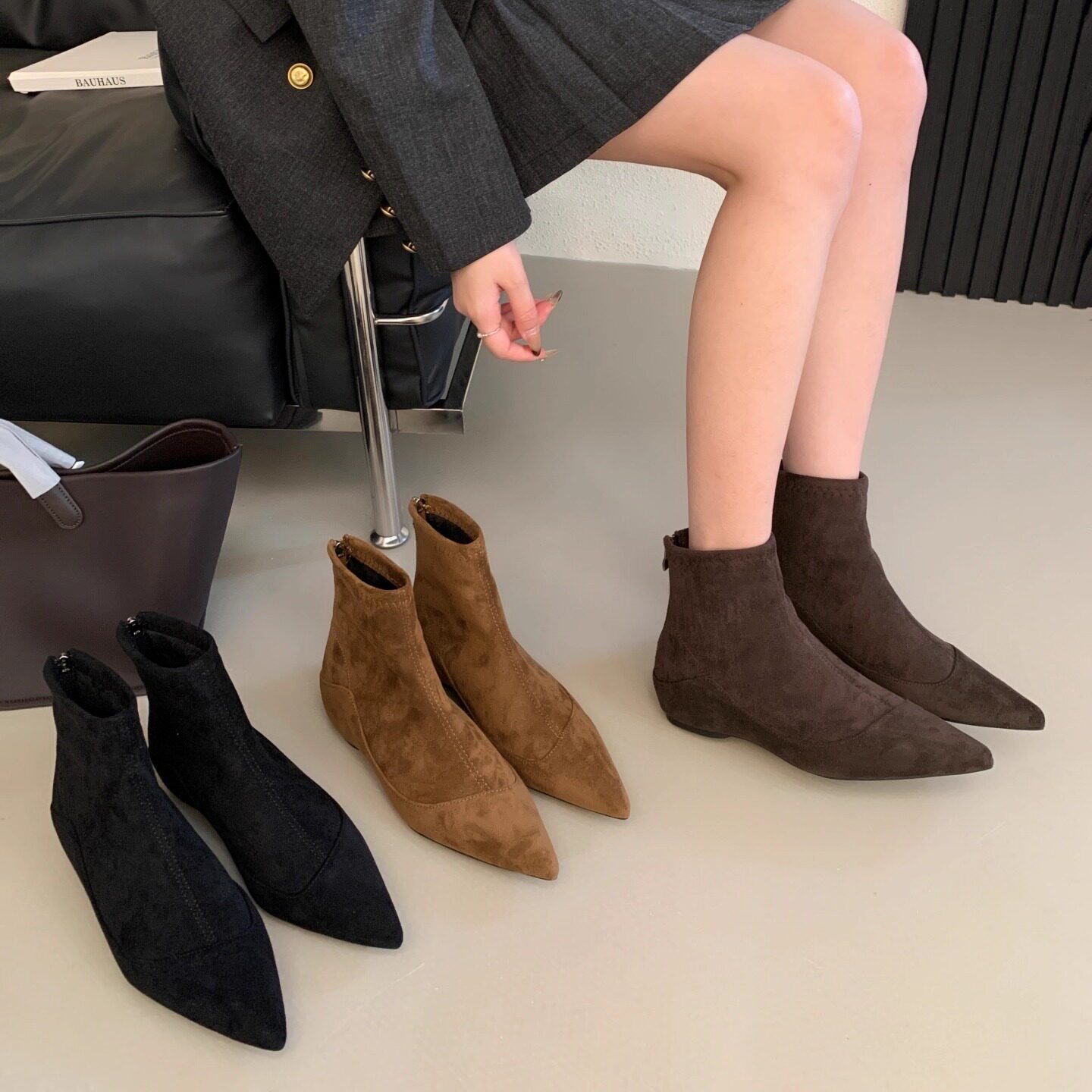 2025秋款绒面尖头低跟平跟内增高后拉链短筒靴裸靴简约百搭靴子