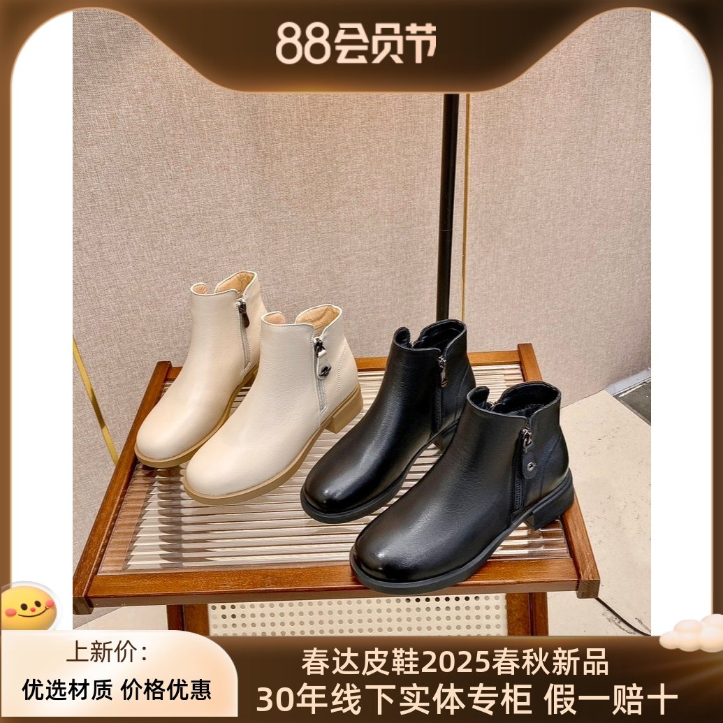 春达粗跟短靴女春秋单靴韩版冬季加绒裸靴平跟真皮切尔西马丁靴子
