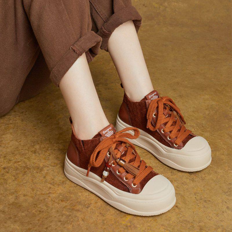 裸靴女士平底真皮运动休闲系带款高帮皮鞋女高腰平跟牛皮柔软短靴