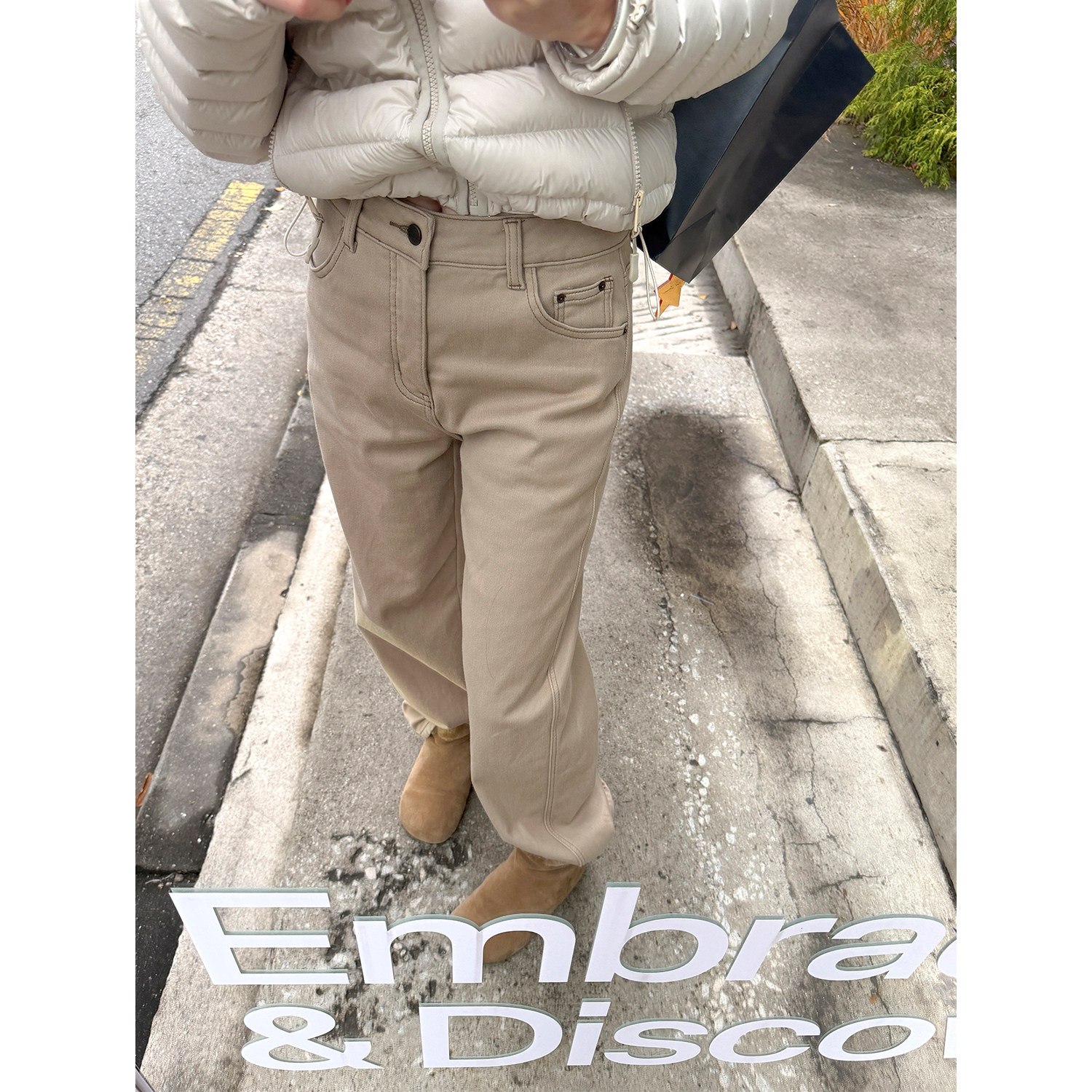 YANGLE_加绒牛仔裤女2025年冬季新款韩版加厚窄版直筒卡其色裤子