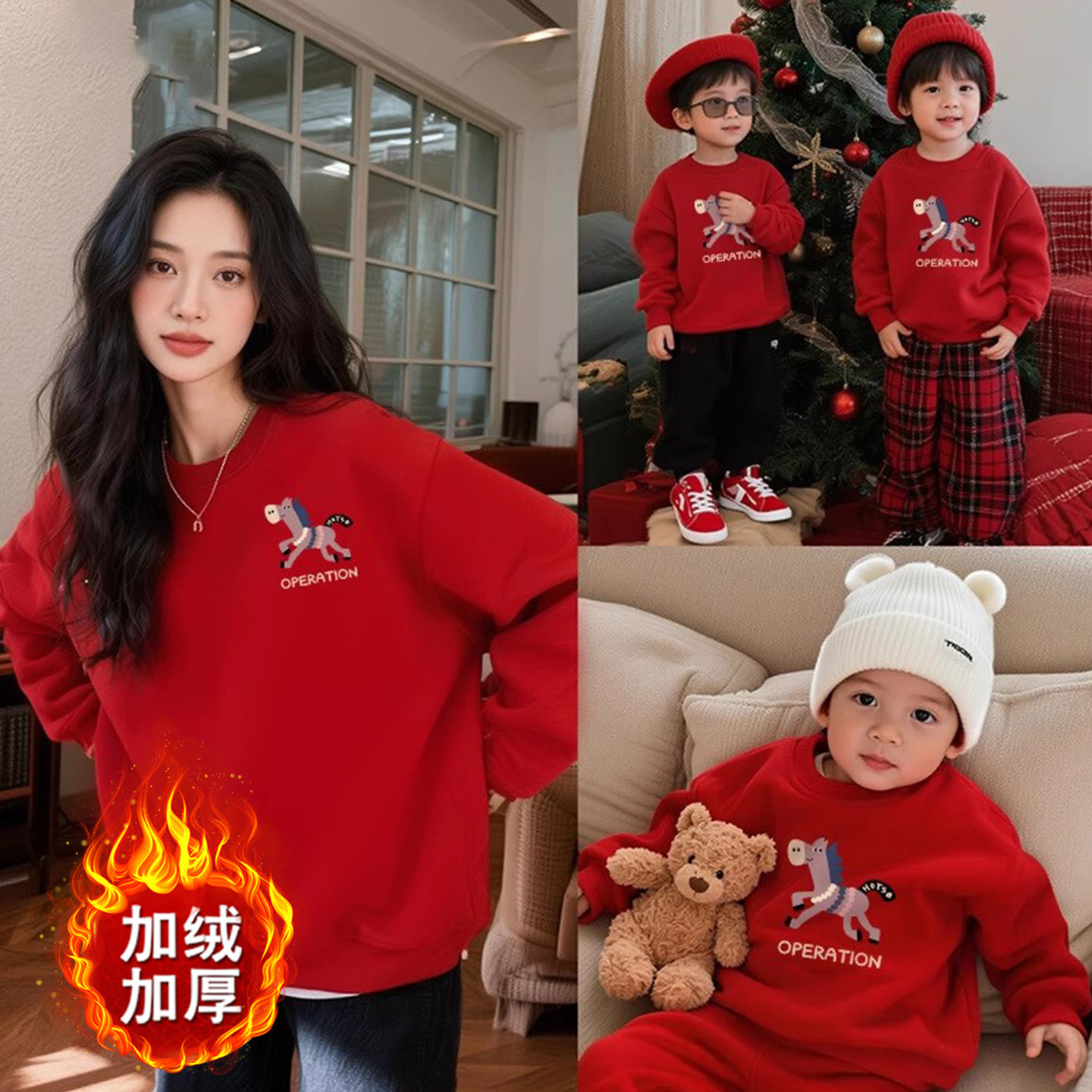 2026喜庆大红色母女装马年卡通可爱上衣加绒加厚亲子装圆领卫衣潮