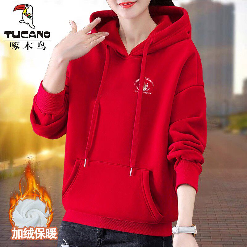 啄木鸟2025蛇年大红色加绒连帽卫衣女秋冬新款减龄爆款洋气上衣潮
