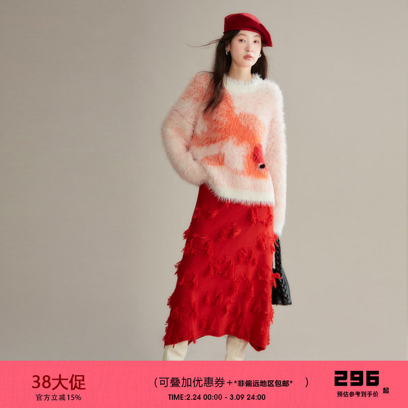 有耳uare原创设计 大红色欢乐气氛不规则提花A字羊毛中长半身裙