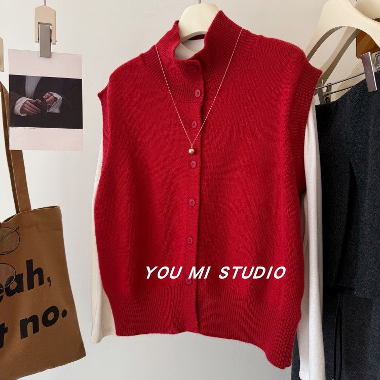 超正的大红色~绵羊毛兔毛混纺 立领单排扣叠穿针织马甲无袖背心女