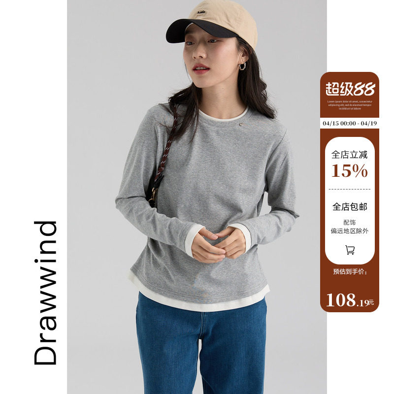 画风drawwind2026春季新款长绒棉长袖T恤女宽松圆领假两件打底衫