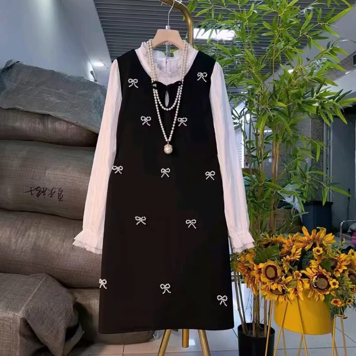 胖MM300斤特大码假两件长袖连衣裙女秋季新款甜美百搭打底衫裙子