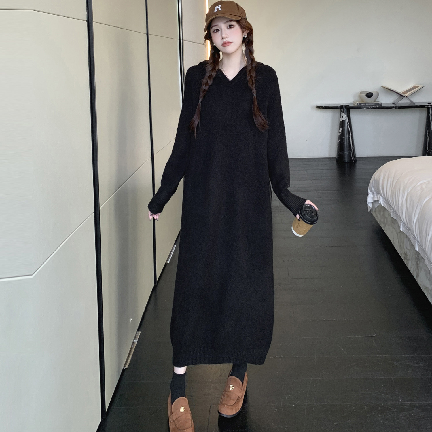 秋冬新款大码女装胖mm长款打底针织连衣裙配大衣打底宽松连帽裙子