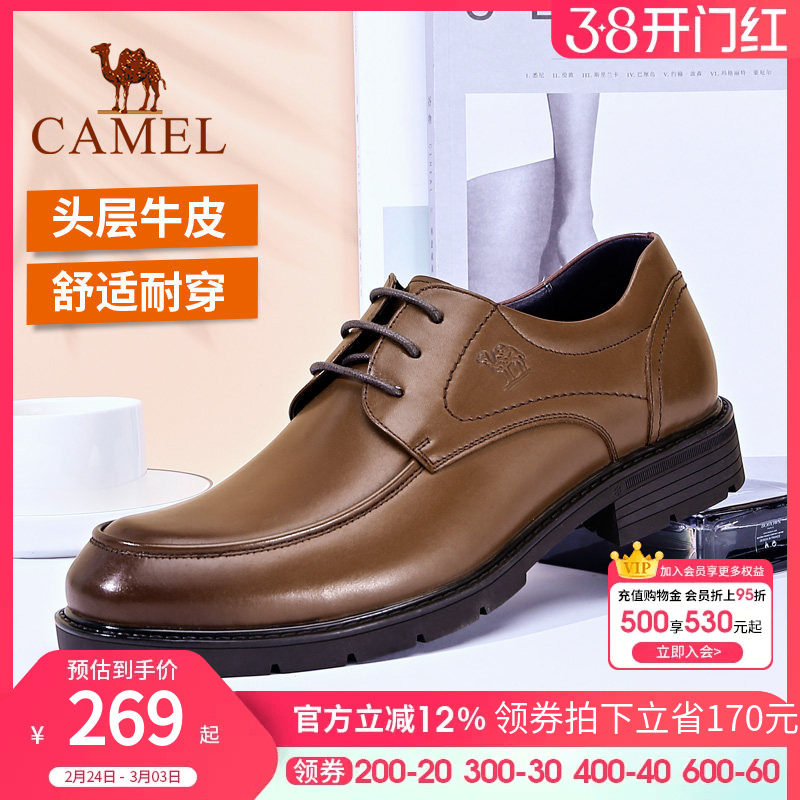 骆驼男鞋真皮正品商务厚底防滑牛皮精英德比三接头正装皮鞋新郎鞋