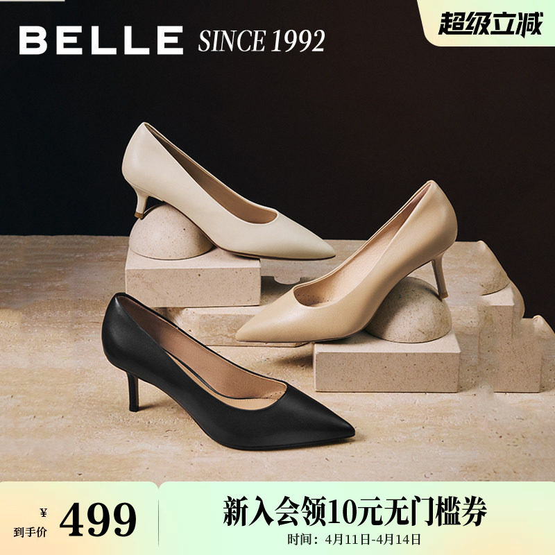 【精致主义】百思图26春新款尖头白色裸色高跟鞋真皮黑色女单鞋