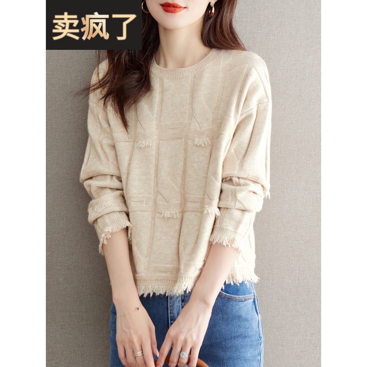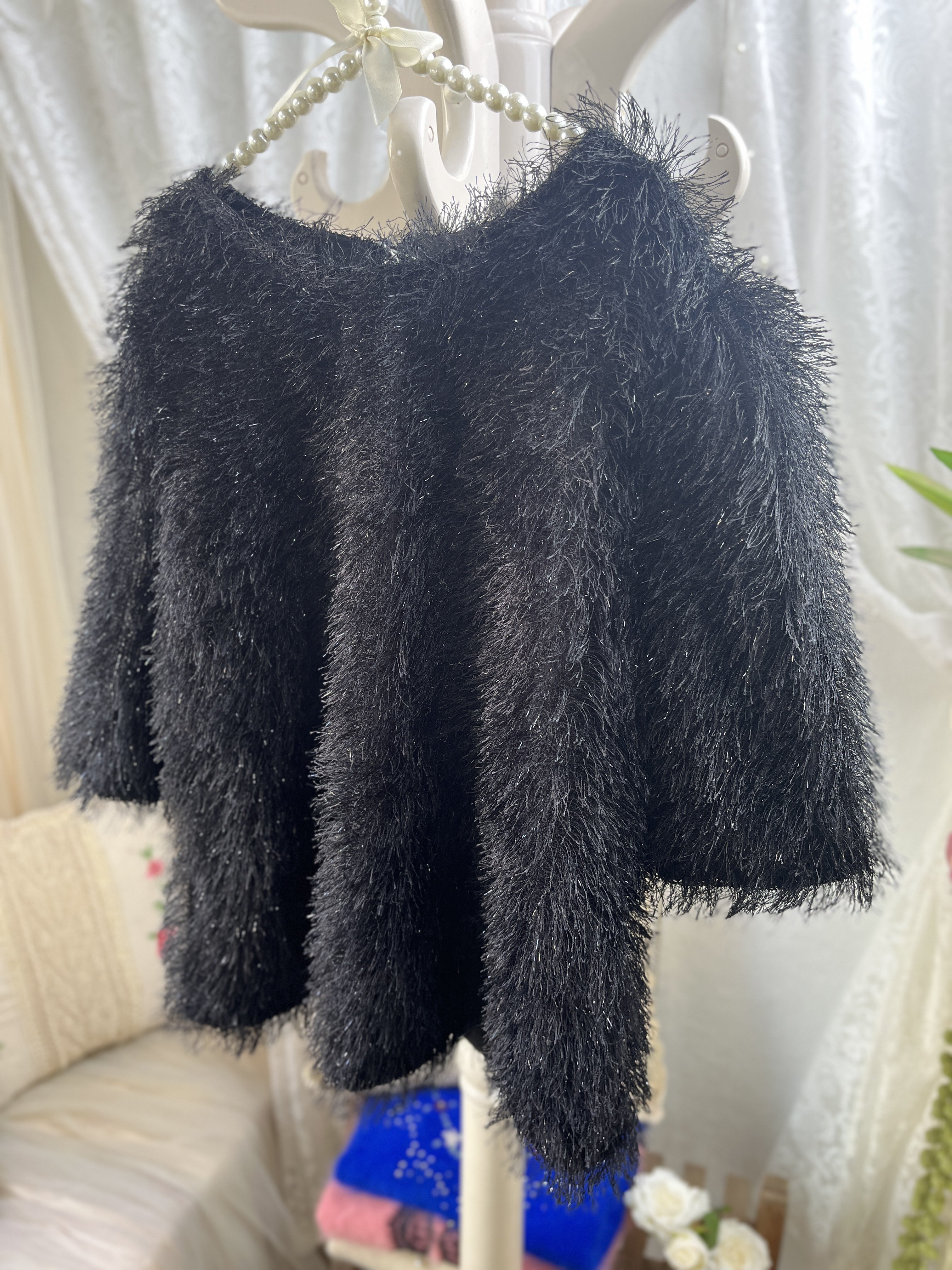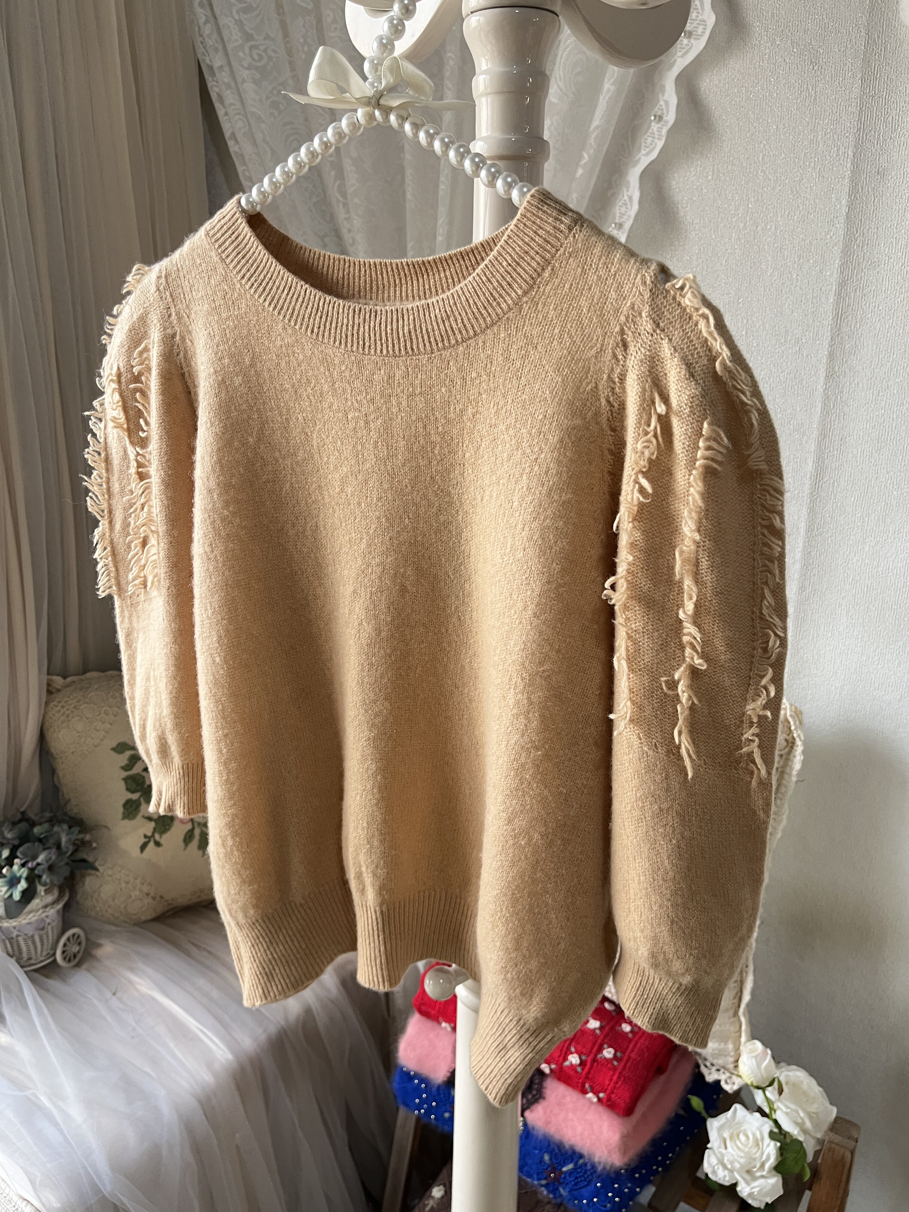 日系甜美风卡其色泡泡中袖流苏圆领短款套头毛衣女兔毛软萌妹系列