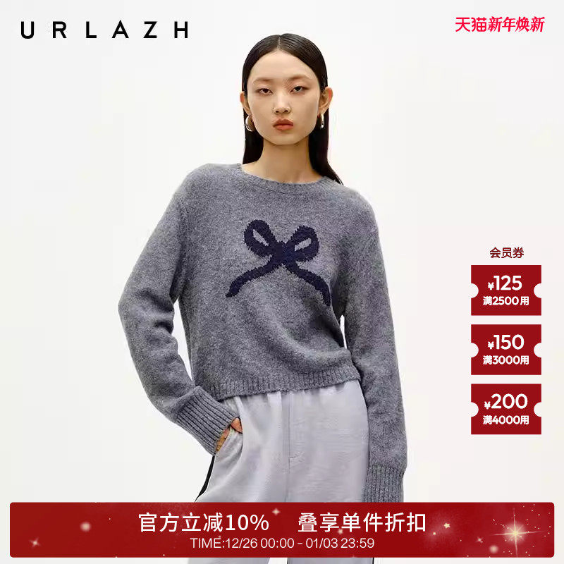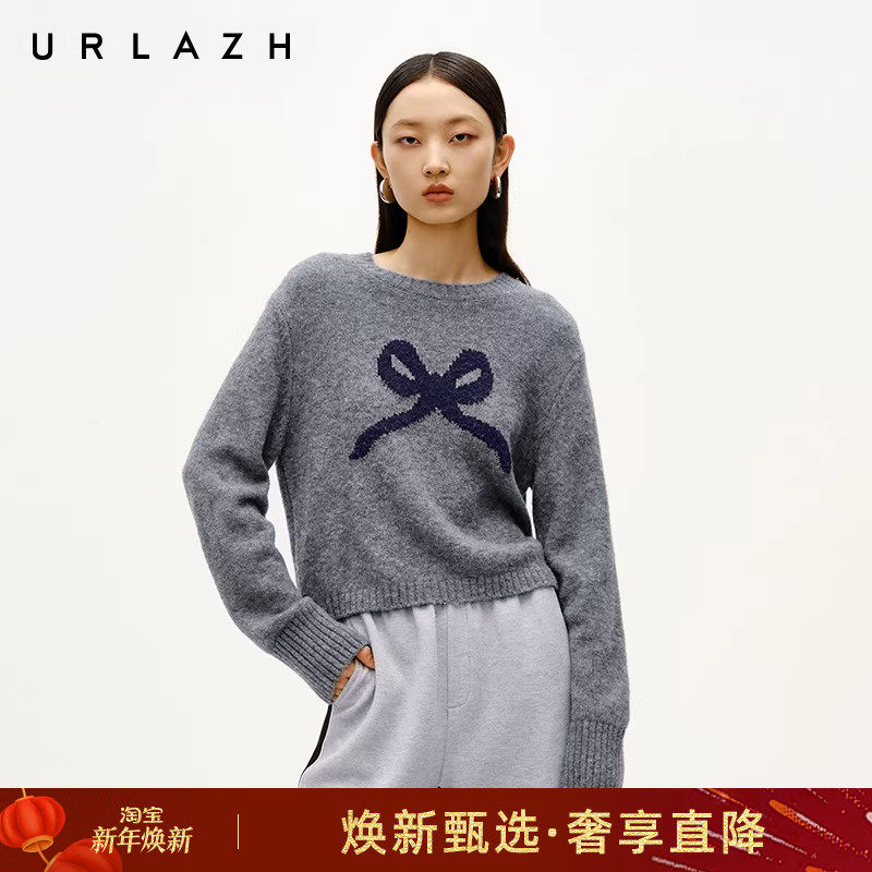 URLAZH有兰冬季新款烟灰色蝴蝶结圆领软糯羊毛针织短款套头毛衣女