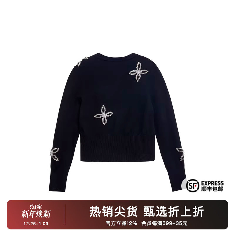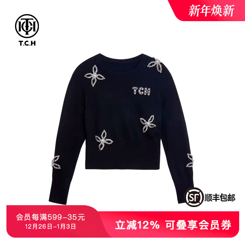 TCH氛围感烫钻圆领黑色百搭显瘦短款套头毛衣女针织衫24春秋新款