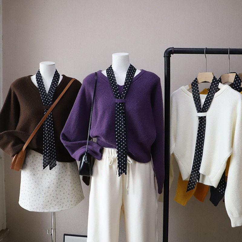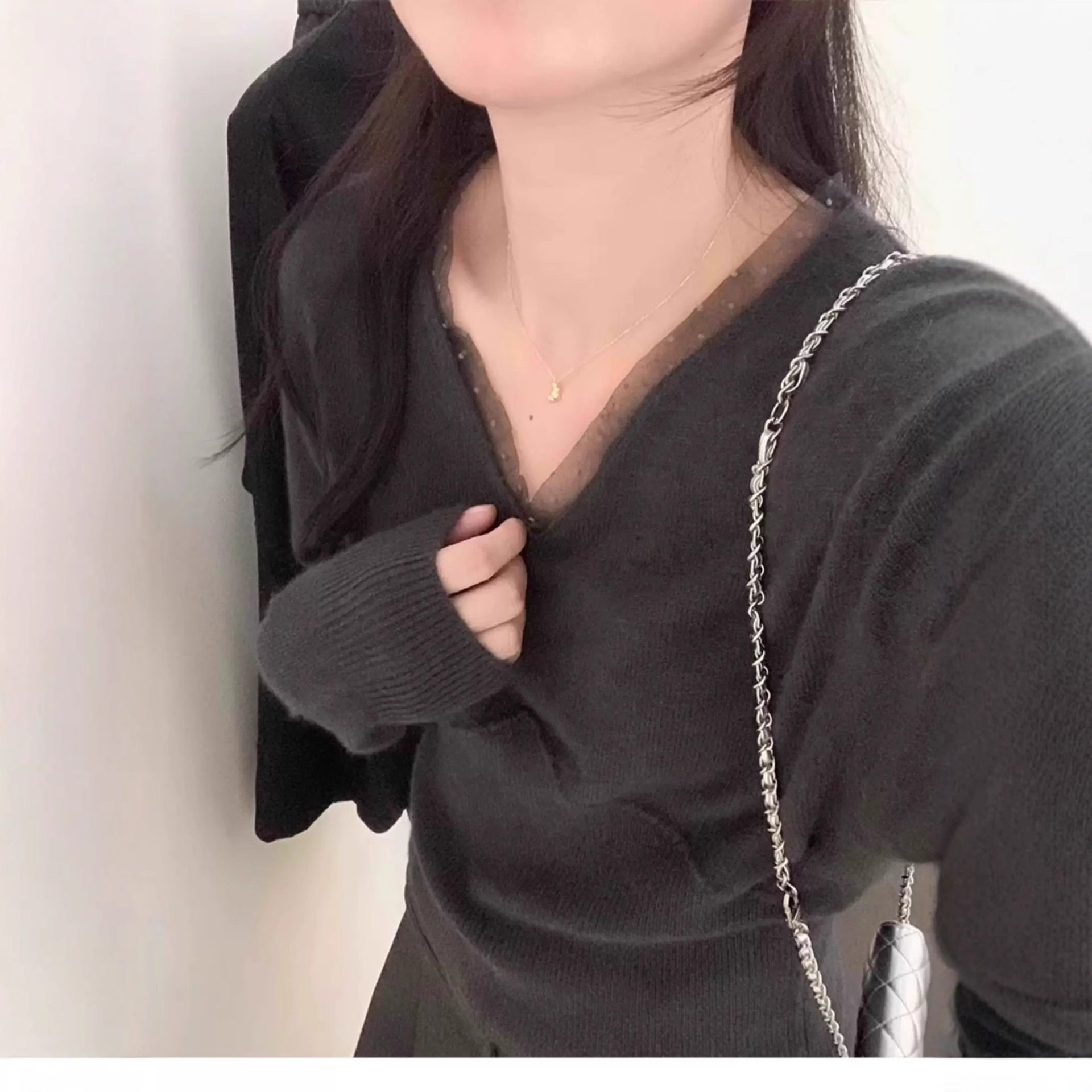 波点蕾丝花边V领针织打底衫秋冬新款精仿羊毛短款套头毛衣女外穿