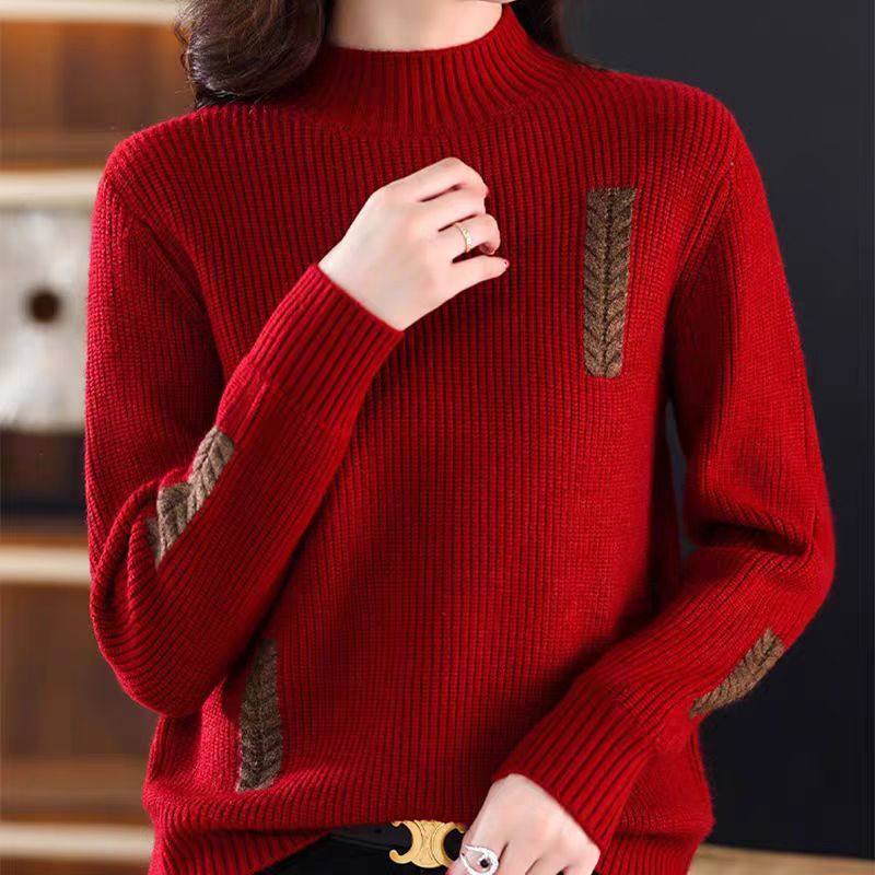 马登酒红色圆领套头修身短款针织衫绞花内搭加厚毛衣上衣女士秋冬