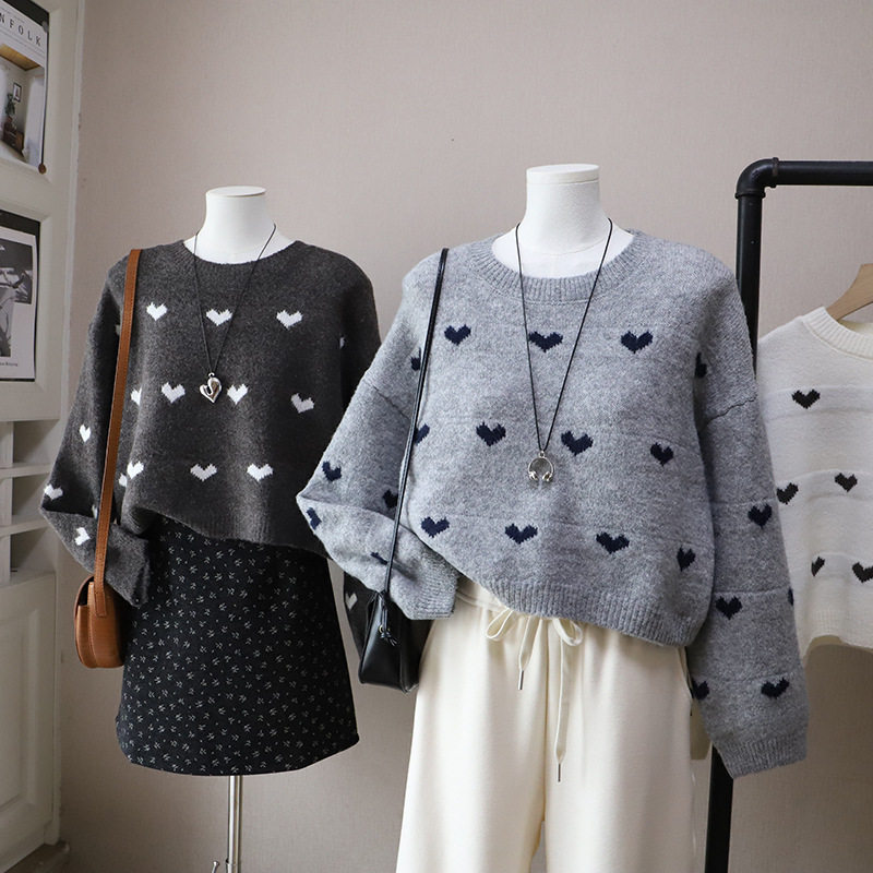 [比正]2025秋冬新款韩版圆领爱心宽松显瘦百搭短款套头毛衣女5557