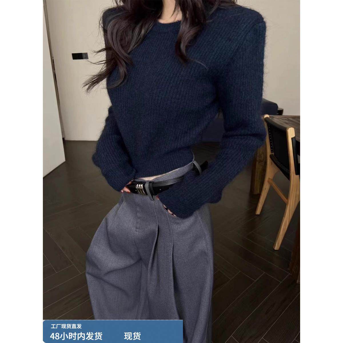 藏青色垫肩短款套头毛衣女秋冬老钱风正肩修身内搭打底针织衫上衣