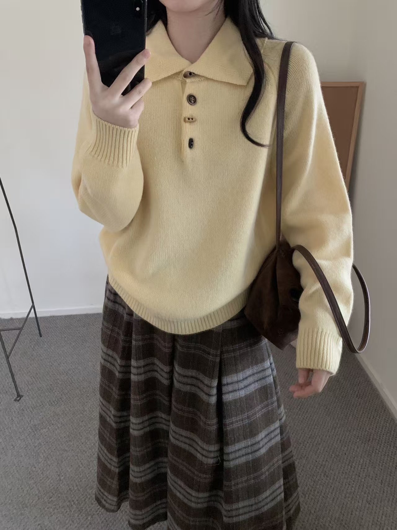 欧韩时尚全羊毛甜美纯色翻领半开扣短款套头毛衣女秋冬软糯针织衫