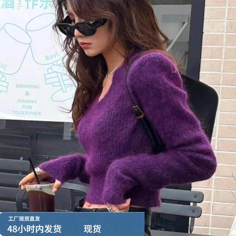 紫色v领短款套头毛衣女秋冬轻熟老钱风正肩修身针织衫内搭上衣厚