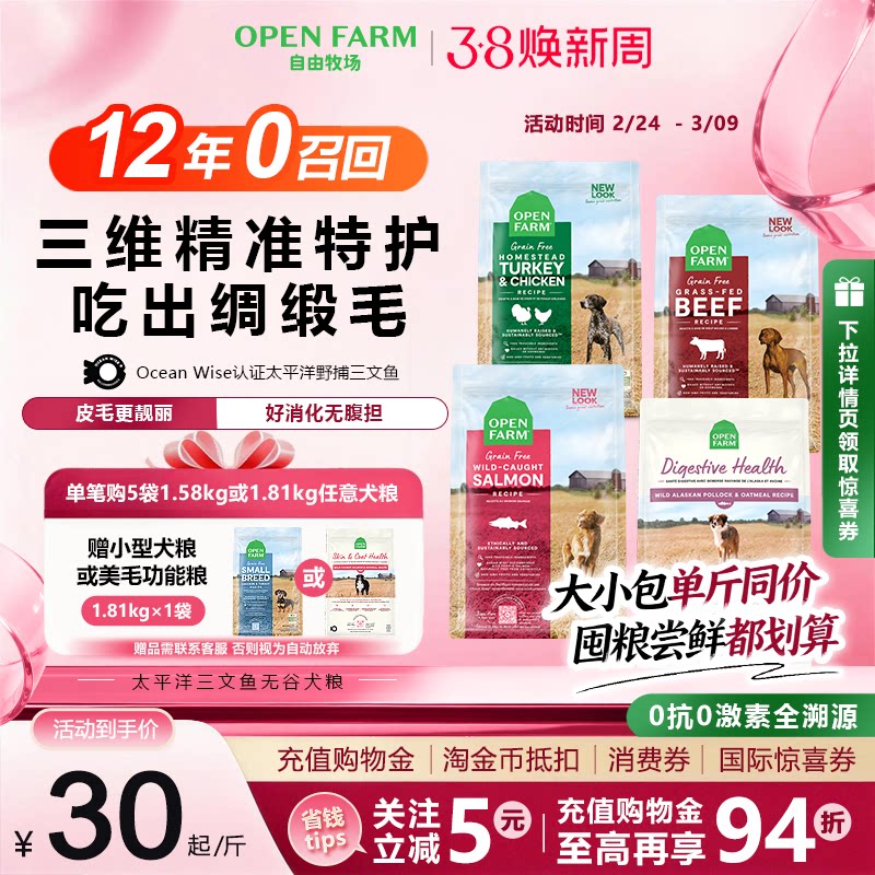 OPEN FARM自由牧场三文鱼火鸡肉牛肉鳕鱼无谷美毛大小型幼犬狗粮