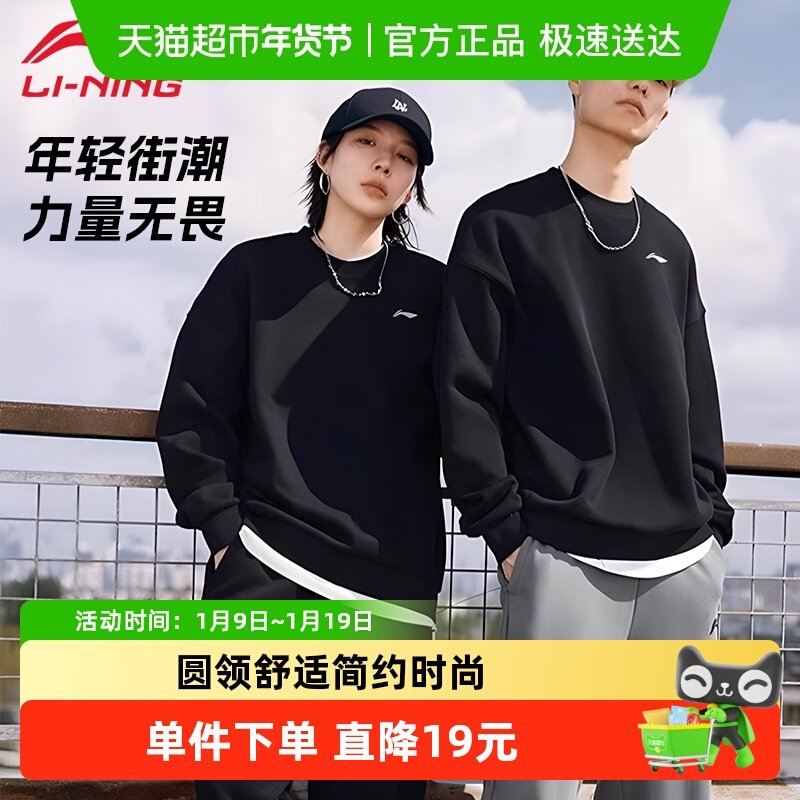 李宁加绒卫衣男士冬季情侣圆领套头衫黑色上衣宽松长袖运动服女款