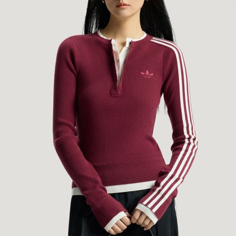 阿迪达斯三叶草红色长袖T恤女2026春季新款假两件针织运动套头衫
