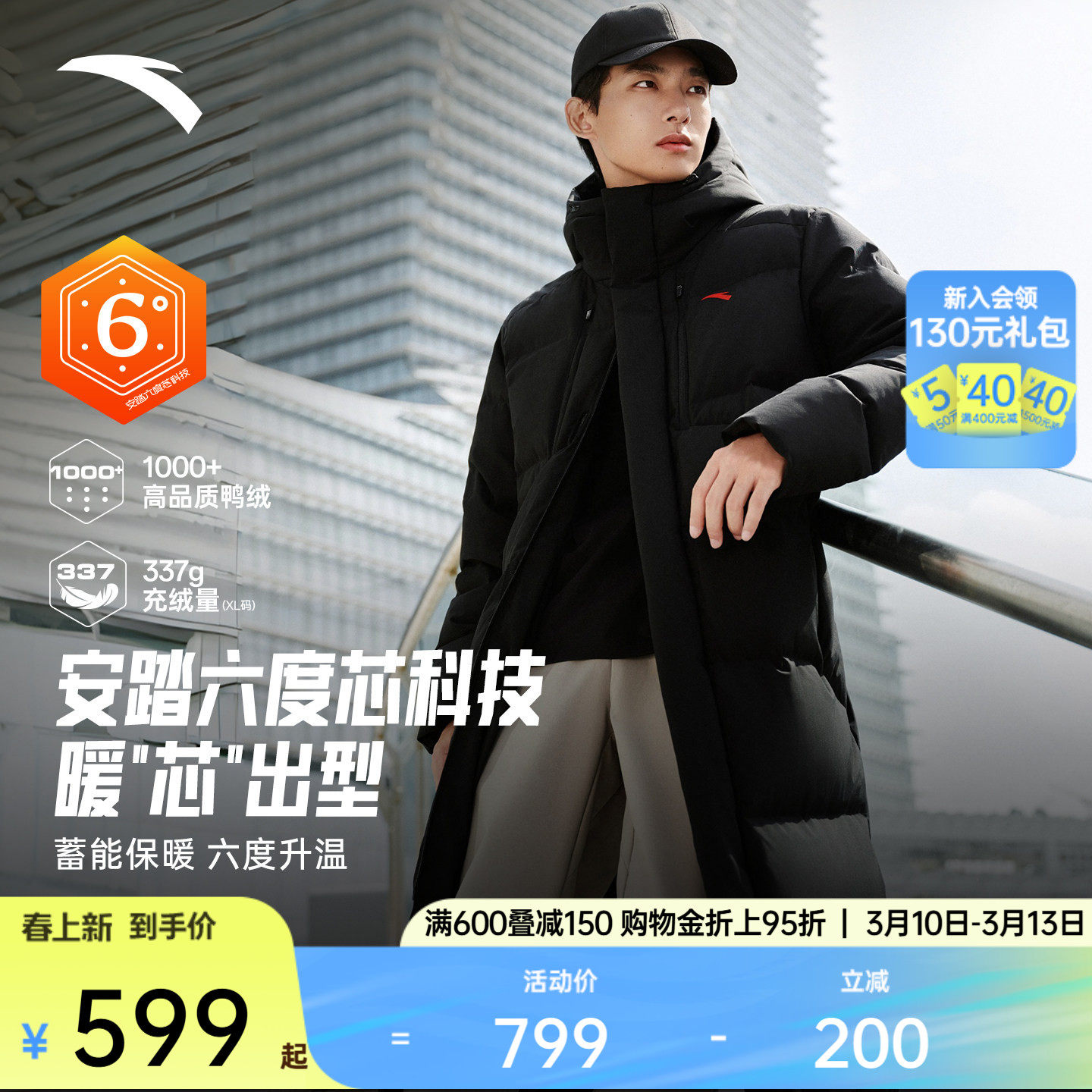 安踏林孝埈羽绒服男士春季新款过膝长款棉服鸭绒保暖运动外套上衣
