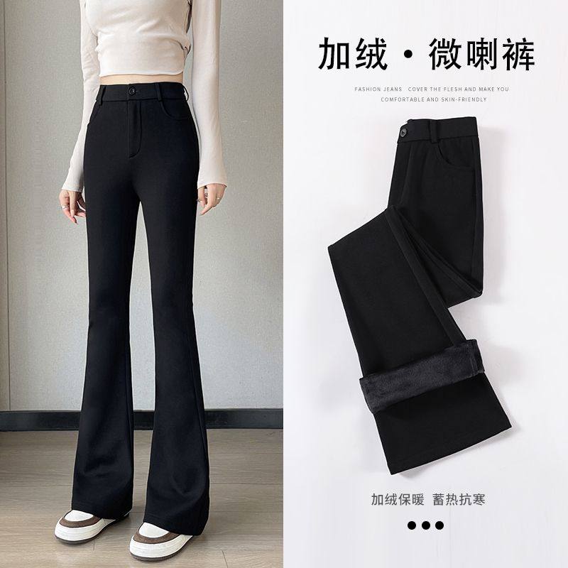 冬季加厚黑色加绒微喇裤女高腰显瘦弹力修身小个子垂感西装喇叭裤