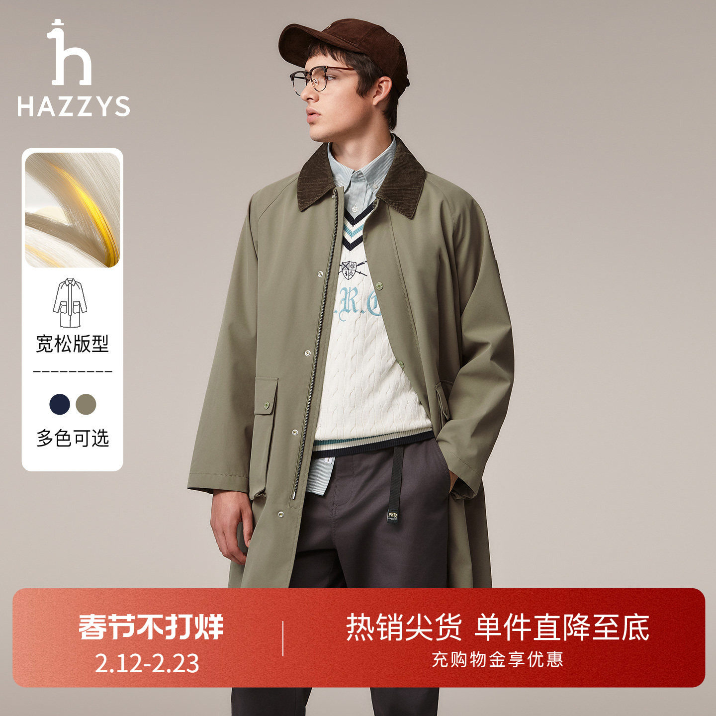 Hazzys哈吉斯秋季宽松男士中长款风衣纯色休闲巴恩风潮流通勤外套