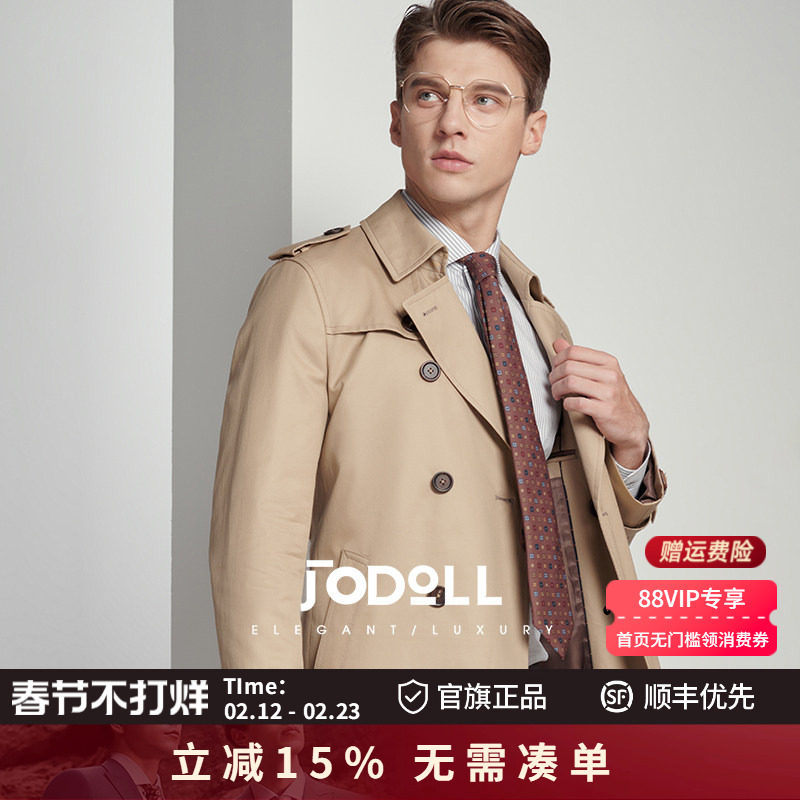 JODOLL/乔顿男士中长款风衣商务休闲翻领双排扣卡其色外套