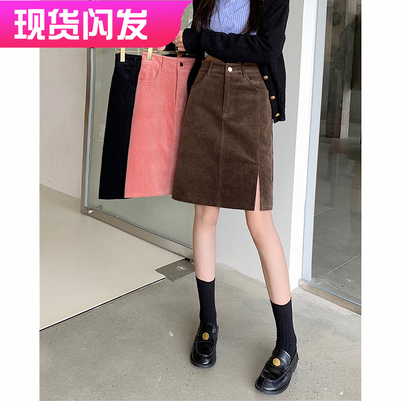 复古开叉灯芯绒半身裙女秋冬高腰a字裙大码显瘦百搭学生包臀中裙
