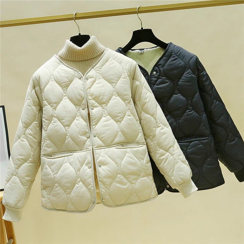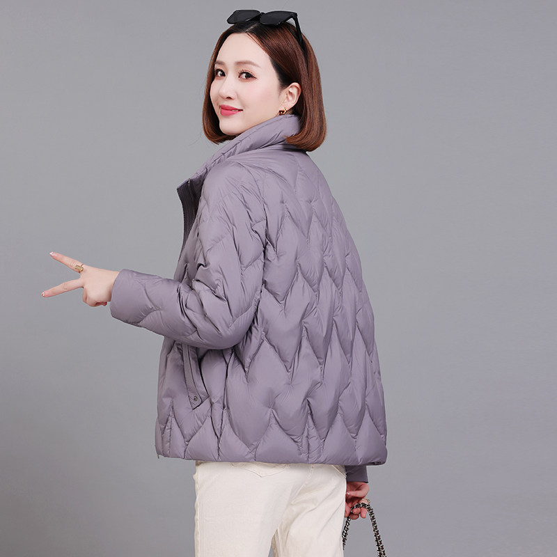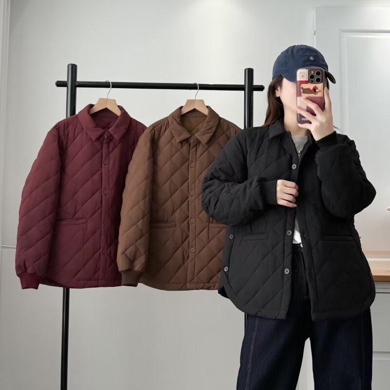 大码女装2025冬季韩版新款胖mm菱格纹棉服女翻领短款轻薄保暖外套