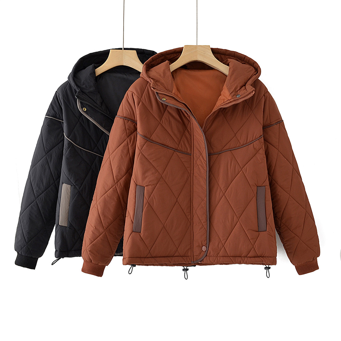 棉衣女大码短款2025秋冬新款胖mm200斤拼色连帽下摆抽绳菱格棉服