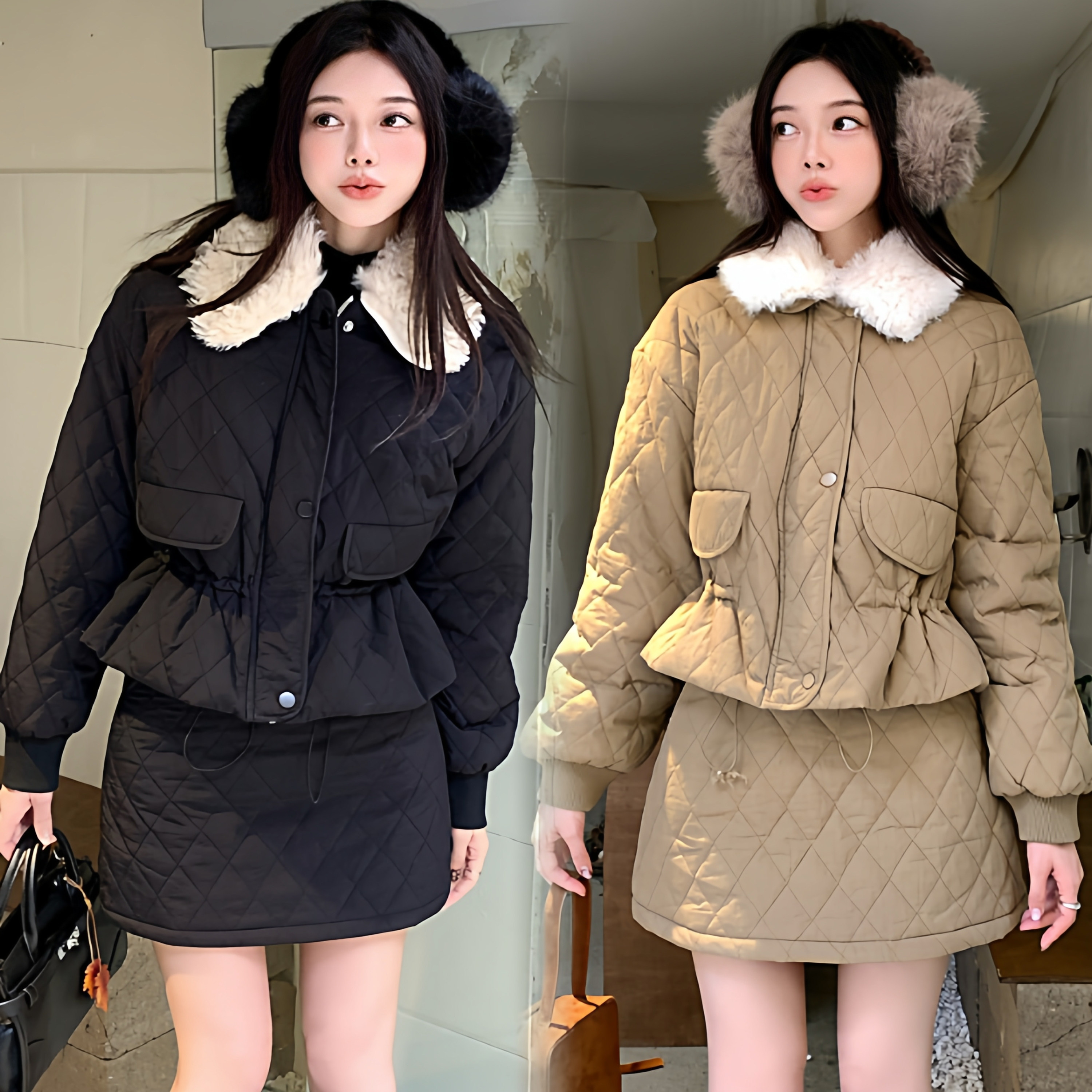 大码女装胖mm冬装收腰遮肉显瘦小香风短款棉服外套半身裙两件套装