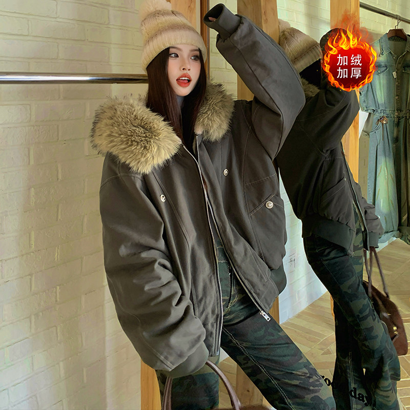 加绒加厚羽绒棉衣棉服女秋冬大码胖mm欧货派克服棉袄外套短款上衣