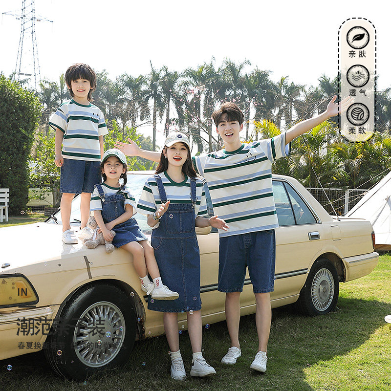 亲子装一家三口家庭夏装全家福套装洋气潮 四口条纹T恤母女背带裤