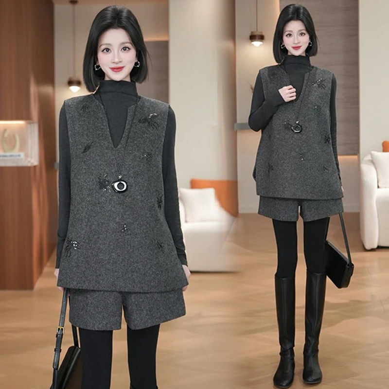 时尚洋气毛呢套装女冬季新款气质高级感韩版马甲打底衫短裤三件套